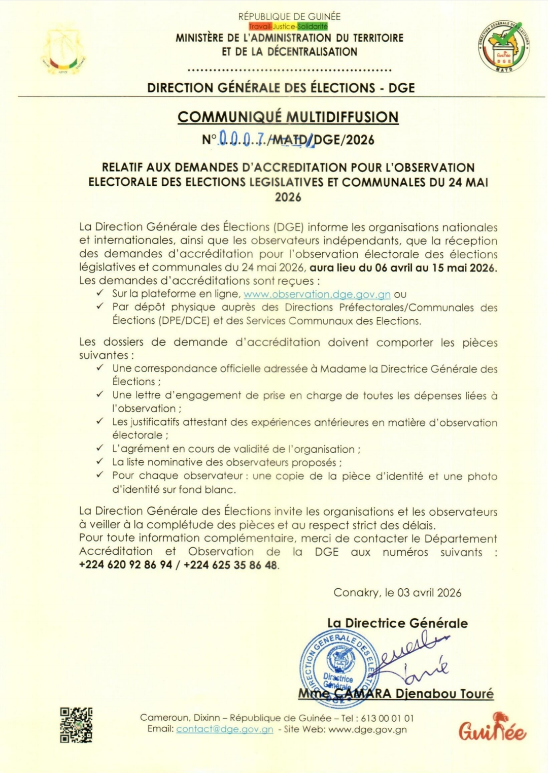 La Direction Générale des Élections (DGE), relevant du Ministère de l’Administration du Territoire et de la Décentralisation, a publié un communiqué annonçant l’ouverture de la période de dépôt des demandes d’accréditation pour l’observation des élections législatives et communales prévues le 24 mai 2026.
