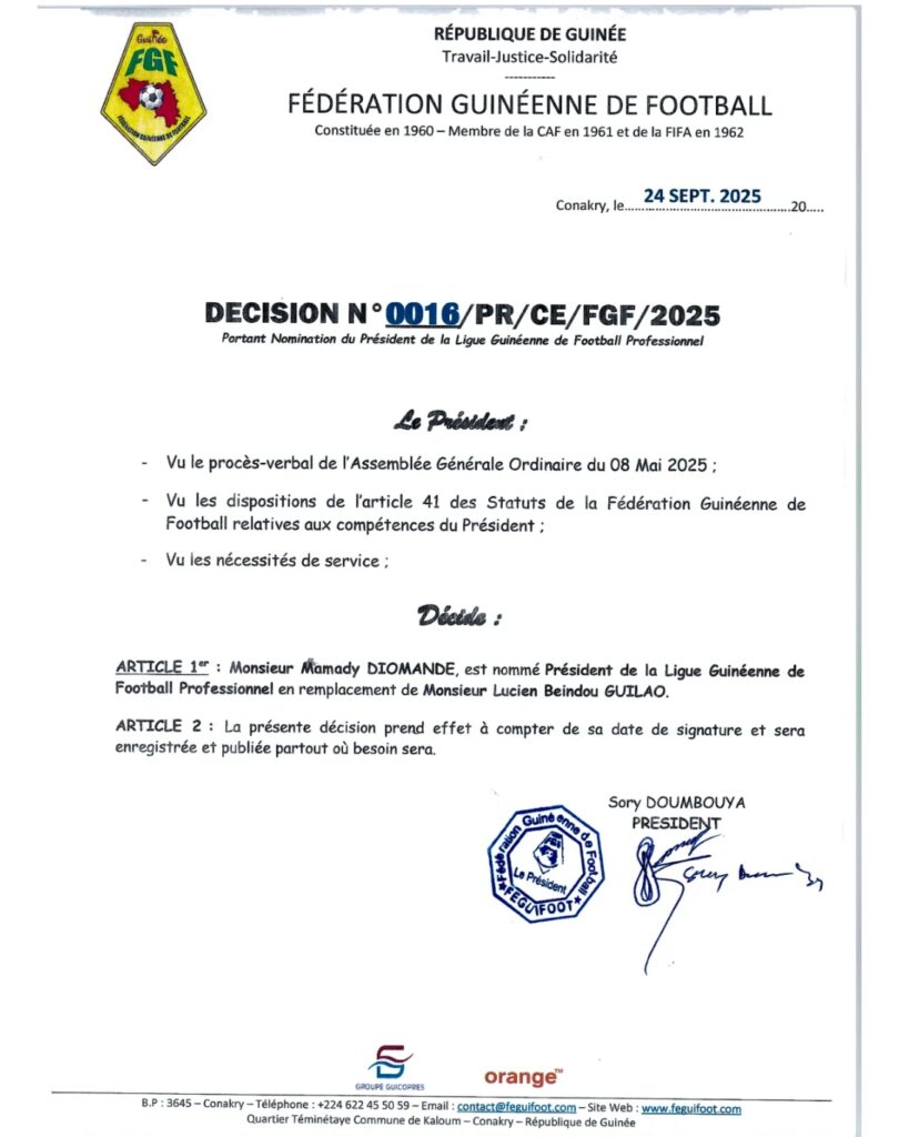Ce mercredi, le président de la Fédération guinéenne de football, Sory Doumbouya, a procédé à un changement au sommet de la Ligue guinéenne de football.