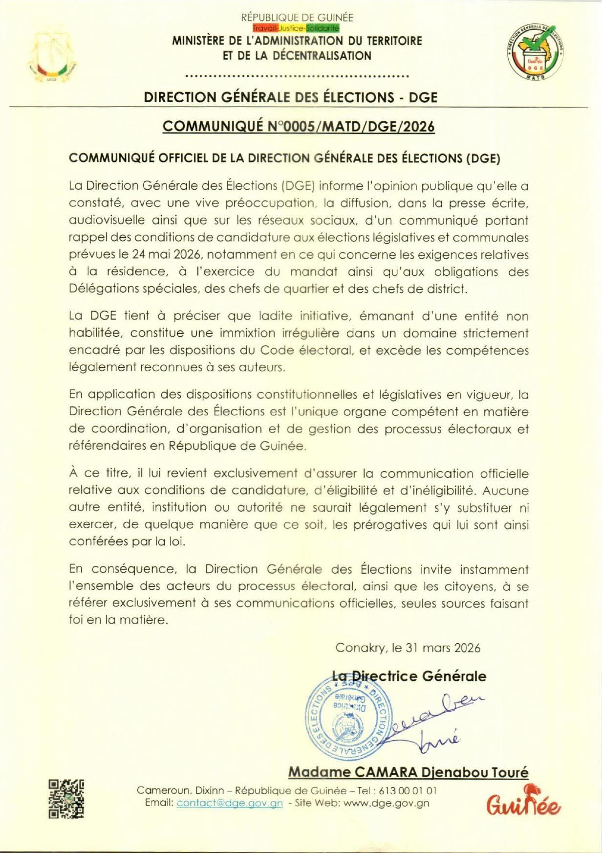 La Direction générale des élections (DGE) a publié, ce 31 mars 2026, un communiqué officiel pour alerter l’opinion publique sur la diffusion d’informations jugées non conformes concernant les conditions de candidature aux prochaines élections législatives et communales prévues le 24 mai 2026.