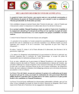 Les Forces Vives de Guinée (FVG) ont publié ce lundi 3 novembre 2025 une déclaration dans laquelle elles critiquent la décision du général Mamadi Doumbouya de se porter candidat à l’élection présidentielle prévue le 28 décembre prochain. Selon elles, cette annonce constitue un « parjure » au regard des engagements initiaux pris lors de la transition.