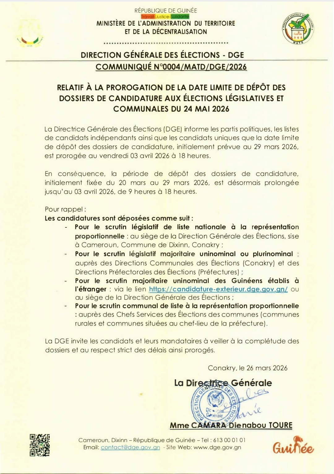 « Initialement fixée au 29 mars 2026, cette échéance est désormais repoussée au vendredi 3 avril 2026 à 18 heures. La DGE précise que cette décision concerne l’ensemble des partis politiques, les listes de candidats indépendants ainsi que les candidatures uniques. »