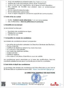Selon les termes de référence publiés par l’institution, ce recrutement vise à renforcer le dispositif organisationnel et technique mis en place pour assurer le bon déroulement du processus électoral.