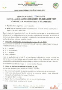À moins de trois semaines de l’élection présidentielle prévue le 28 décembre 2025, la Direction Générale des Élections (DGE) a publié une directive majeure encadrant la désignation des membres des bureaux de vote sur l’ensemble du territoire national.