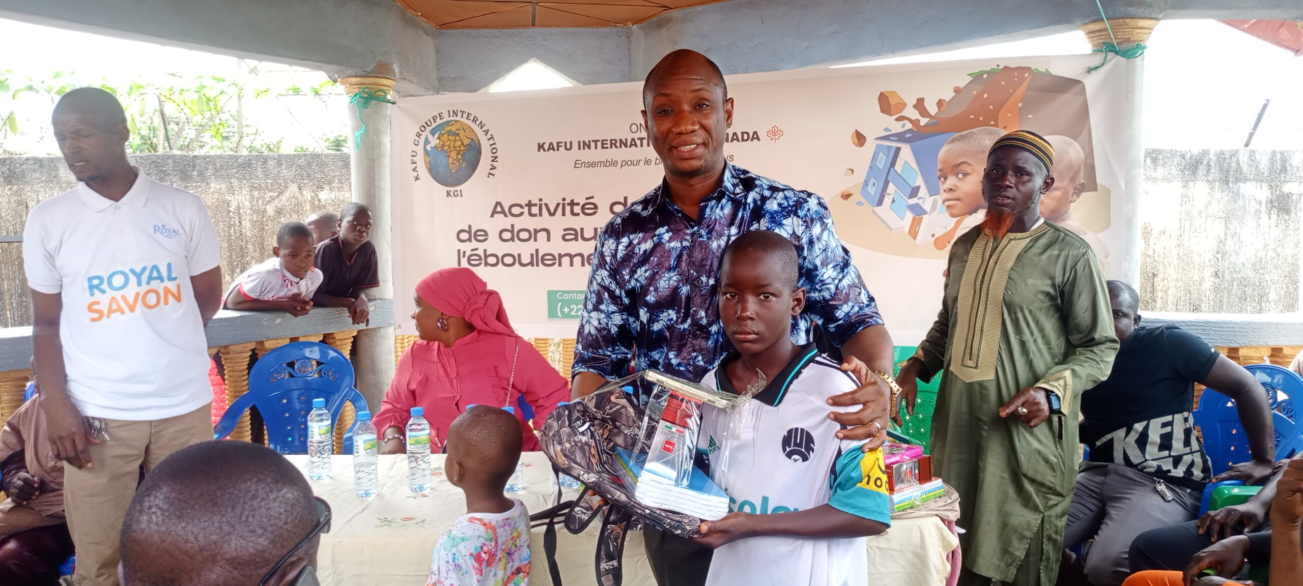 L’ONG Kafu Group International (KGI) a procédé, ce samedi 8 novembre 2025, à une remise de dons en faveur des victimes de l’éboulement survenu récemment à Manéah, dans la préfecture de Coyah. L’appui est composé de kits scolaires destinés aux enfants affectés ainsi que de vivres, notamment une dizaine de sacs de riz, pour les familles touchées.